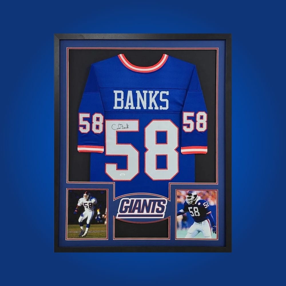 Signed New York Giants jersey by defensive legend Carl Banks. Custom framed, certified authentic, a perfect display piece for Giants fans.