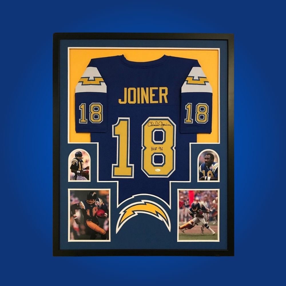 Signed Los Angeles Chargers jersey by legendary wide receiver Charlie Joyner. Includes certificate of authenticity, professionally framed and ready to display for any Chargers fan.