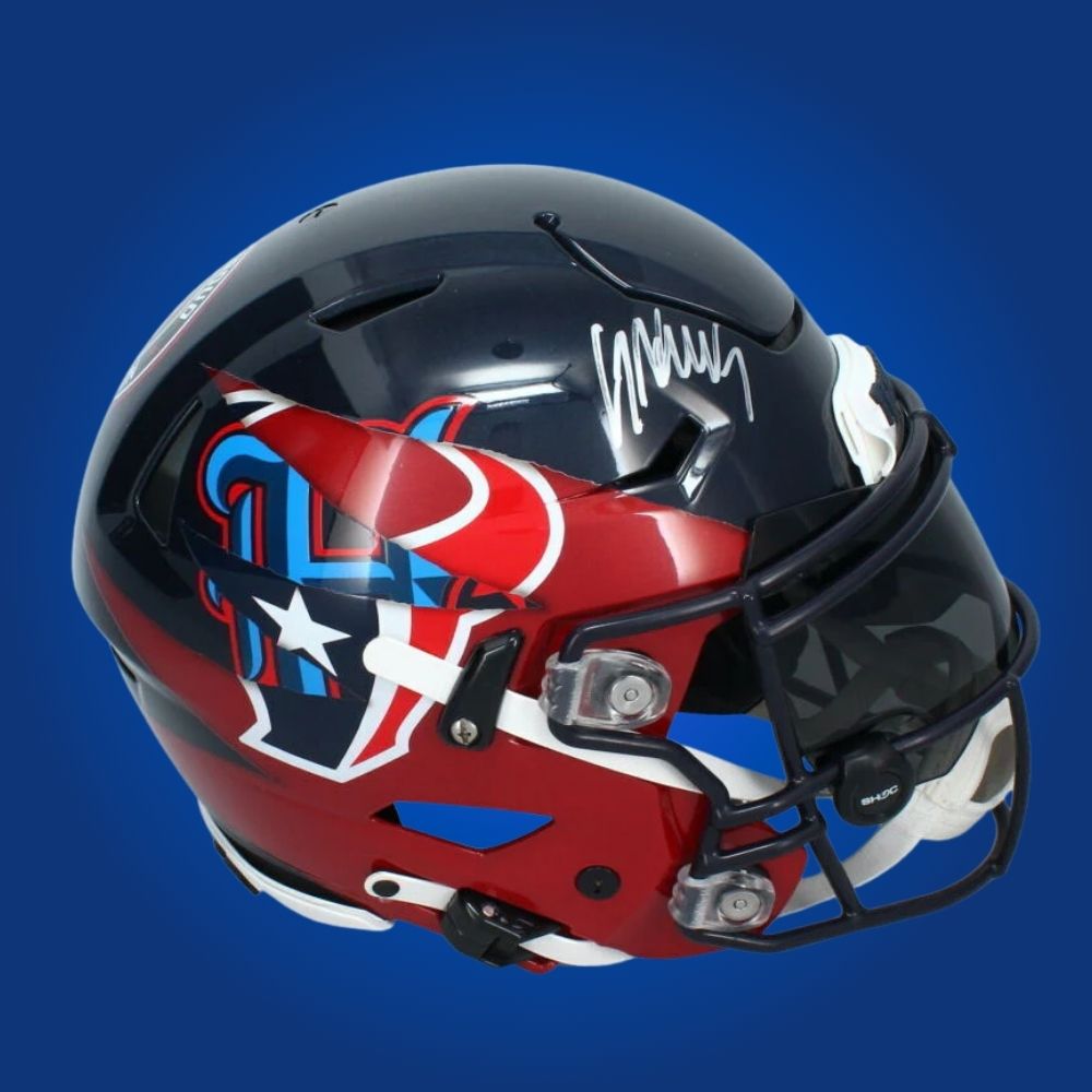 The CJ Stroud Signed Houston Texans FSM H Town Ripped SpeedFlex Helmet displays a bold, ripped motif and CJ Stroud’s autograph, making it a top-tier collectible for Houston supporters.