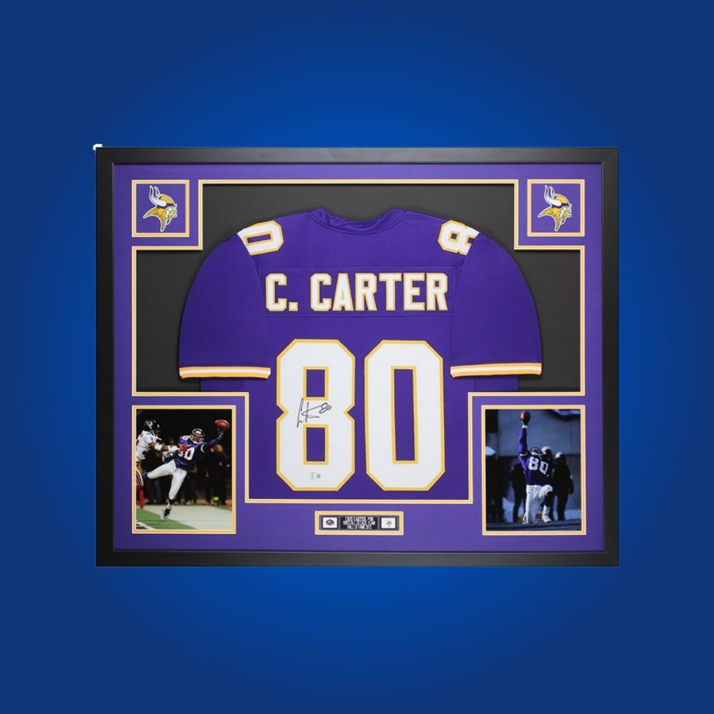 Autographed Minnesota Vikings jersey by Hall of Fame wide receiver Cris Carter. Professionally framed and includes certificate of authenticity.