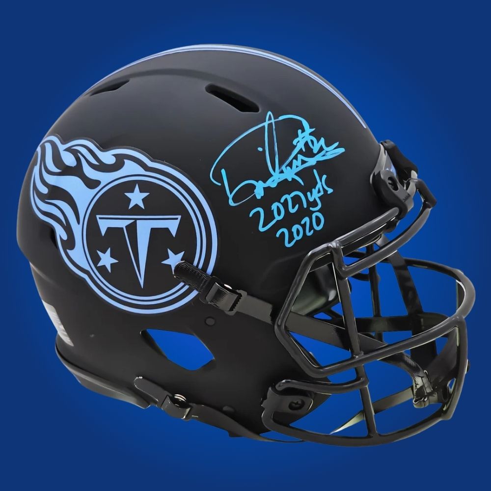 The Derrick Henry Signed Tennessee Titans Eclipse Speed Authentic Helmet displays a dramatic eclipse style, autographed by Derrick Henry, perfect for fans of the Titans’ star rusher.