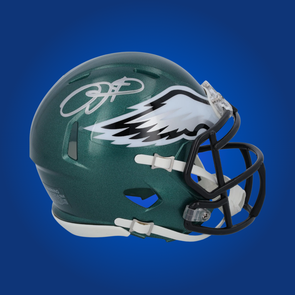 Autographed Philadelphia Eagles mini helmet by Jalen Hurts. This green Speed mini helmet features his signature, a must-have for Eagles fans. Certified authentic. All items include a Certificate of Authenticity. Please Note: Action images may vary in some listings, which feature standard product images for catalog consistency.