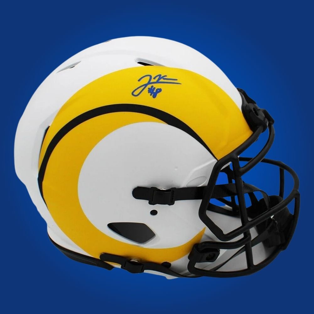 The Jared Verse Signed Los Angeles Rams Lunar Speed Authentic Helmet captures the Rams’ crisp Lunar colors and is autographed by Jared Verse, making it an eye-catching addition for Rams enthusiasts.