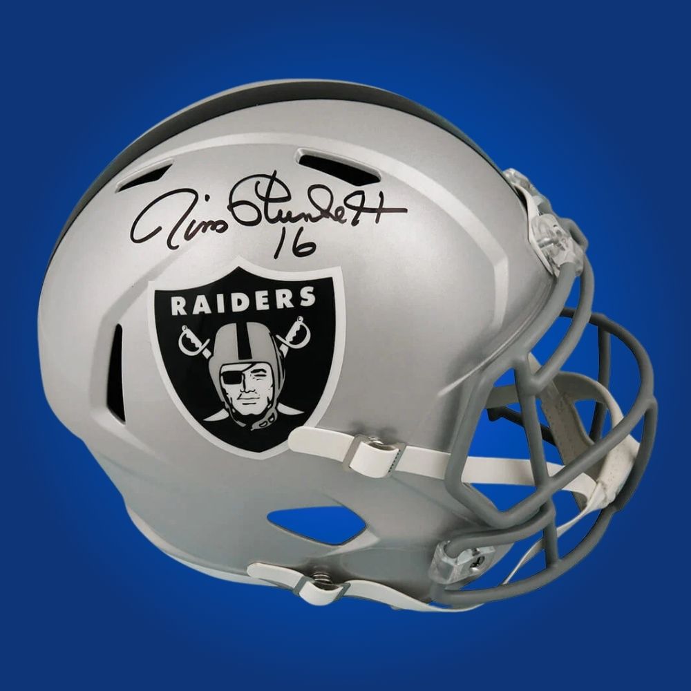 Jim Plunkett Signed Las Vegas Raiders Silver Replica Helmet. Comes with Certificate of Authenticity, a classic collectible for Raiders fans and admirers of Super Bowl MVPs.