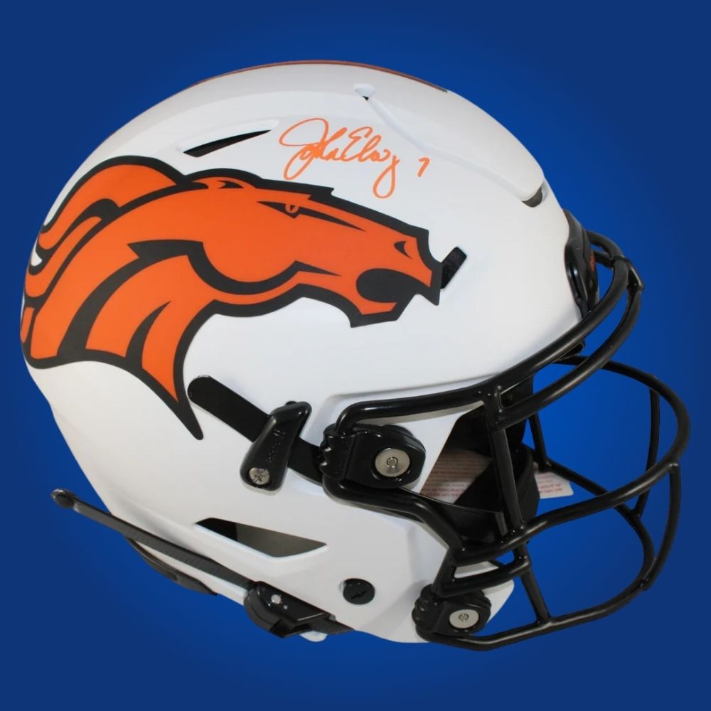 The John Elway Signed Denver Broncos White Lunar SpeedFlex Authentic Helmet offers a sleek lunar white finish, graced by John Elway’s autograph—a standout tribute to a Denver legend.
