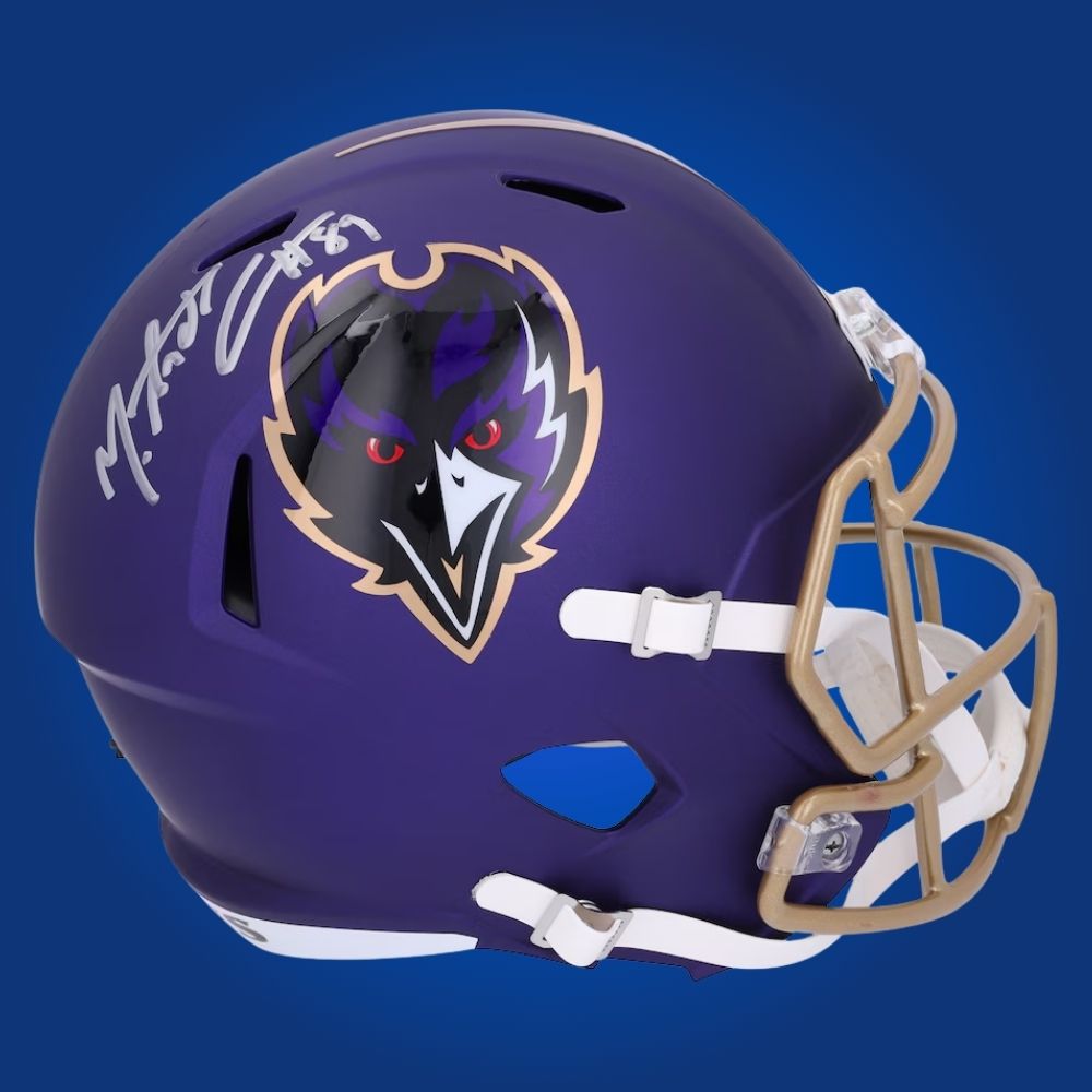 Purple Alternate Speed Replica Helmet signed by Mark Andrews of the Baltimore Ravens. All items come with Certificate of Authenticity, perfect for Ravens enthusiasts.