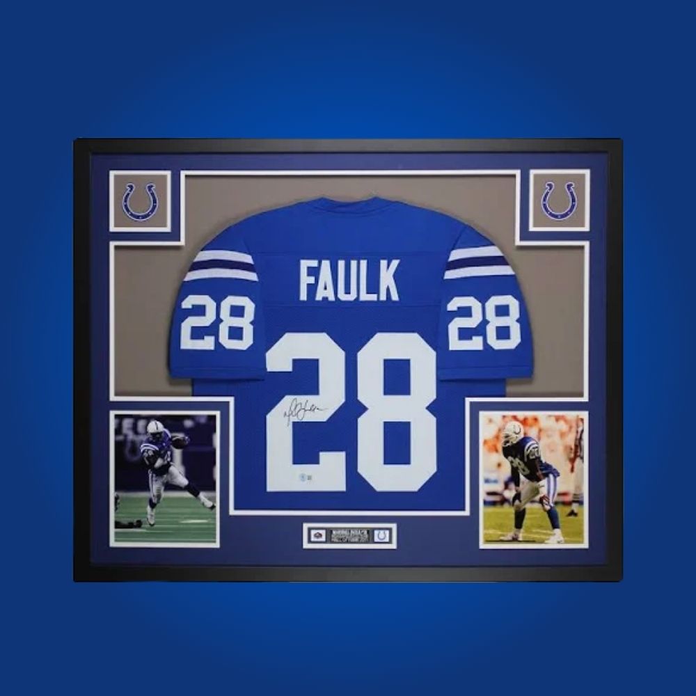 Autographed Indianapolis Colts full framed jersey by Marshall Faulk. Certified authentic, a top piece for Colts memorabilia. All items come with a Certificate of Authenticity. Please note: Some team logos may not be included on full framed matted items. Action images may also differ on some listings for catalog consistency.