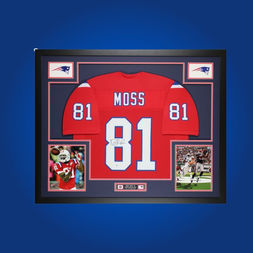 Signed New England Patriots jersey by Hall of Famer Randy Moss. Full-framed, certified authentic, and a must-have for Patriots fans.