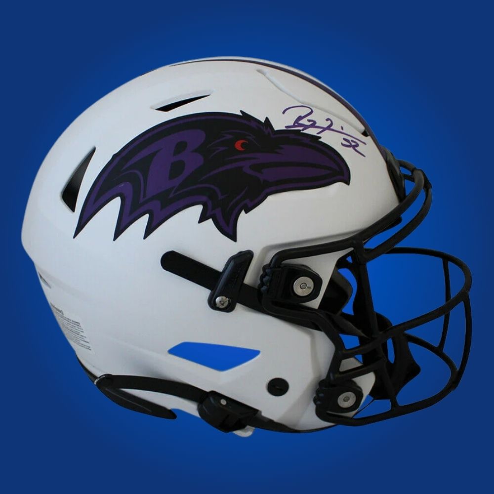 The Ray Lewis Signed Baltimore Ravens Lunar Speed Helmet features a luminous lunar design with Ray Lewis’s bold signature, offering collectors a rare piece from one of the NFL’s most iconic linebackers.