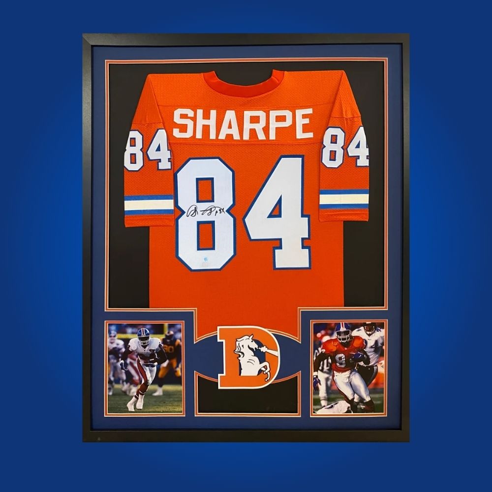 Autographed Denver Broncos full framed jersey by Shannon Sharpe. Certified authentic, a top piece for Broncos memorabilia. All items come with a Certificate of Authenticity. Please note: Some team logos may not be included on full framed matted items. Action images may also differ on some listings for catalog consistency.
