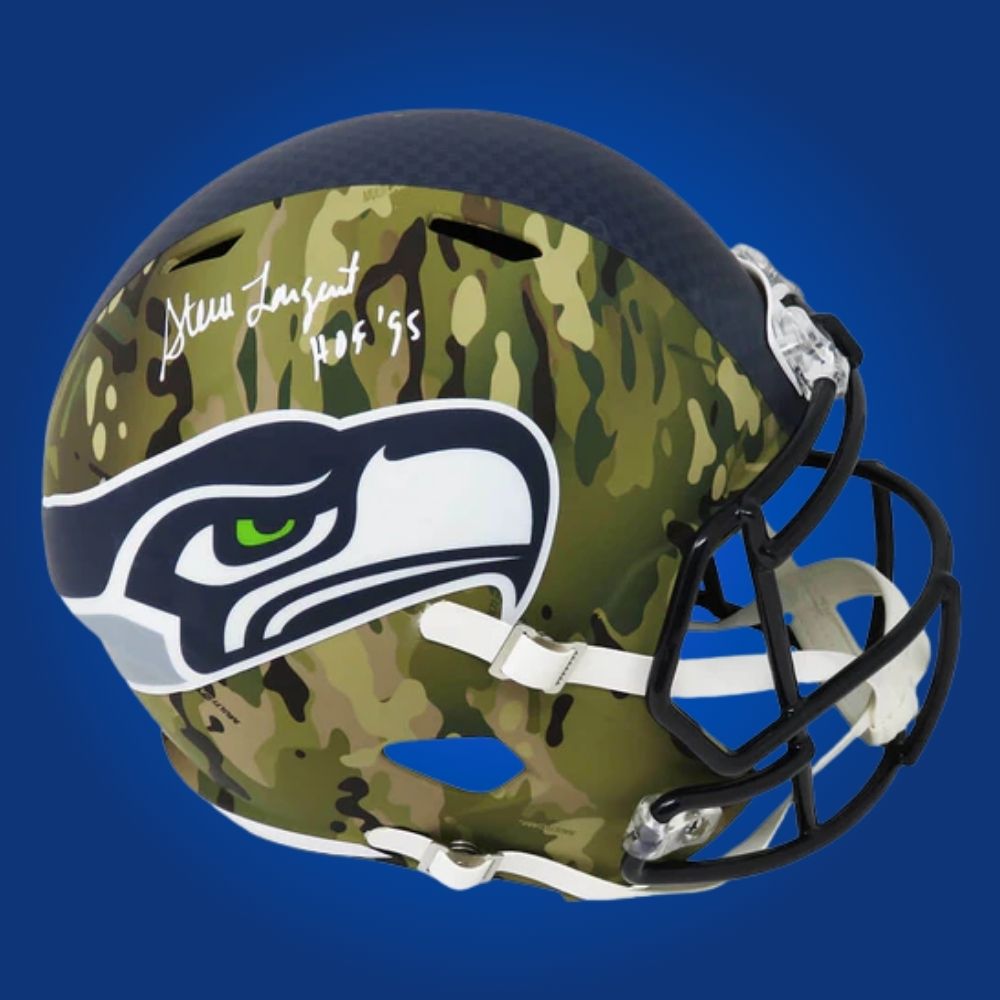 Steve Largent’s Seattle Seahawks Camo Speed Replica Helmet, personally autographed, stands as a rare treasure for Seahawks faithful and collectors of Hall of Fame receivers.