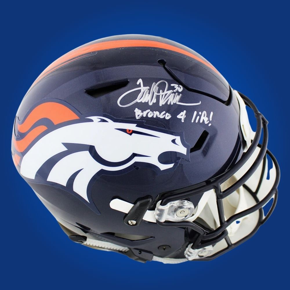 The Terrell Davis Signed Denver Broncos Blue SpeedFlex Authentic Helmet features the Broncos’ iconic blue and is autographed by Hall of Famer Terrell Davis, perfect for displaying championship pride.