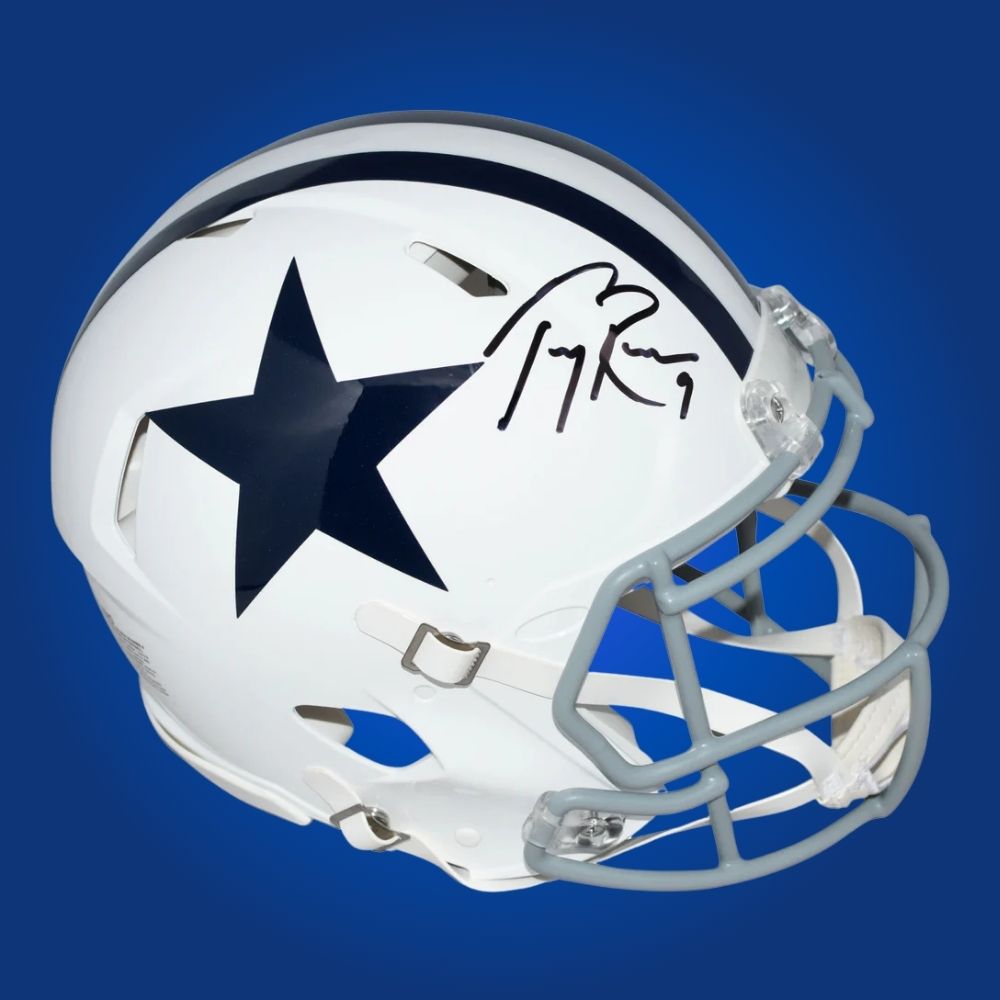 The Tony Romo Signed Dallas Cowboys White SpeedFlex Authentic Helmet is highlighted by Tony Romo’s autograph and the Cowboys’ iconic white styling, a prized piece for Dallas fans.