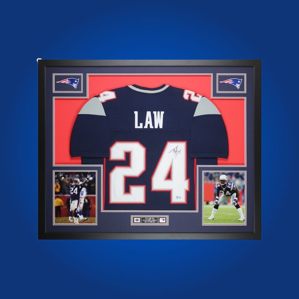 Signed New England Patriots jersey by defensive standout Ty Law. Custom framed, includes a certificate of authenticity for collectors.